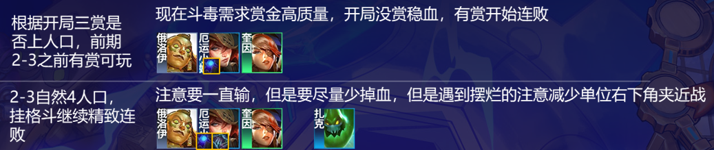 赏金在高分段其实运营难度较高当然对高分段也是一种羁绊技巧,低分段的话更好控制学会基本逻辑几乎等于虐菜,前期赏金就是注意稳血加连败,不需要在乎装备连败加上烈娜塔正常运营弱势,卡和装备都很好拿,开局没3赏就上人口稳血嫖卡,有赏之后开始连败,要把连败尽可能的拉长,减少掉血。