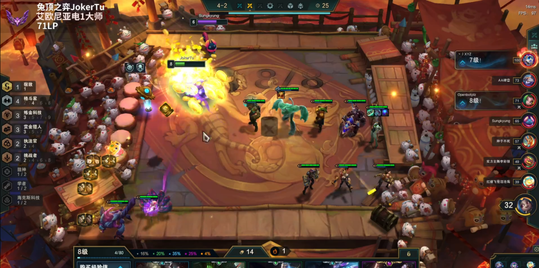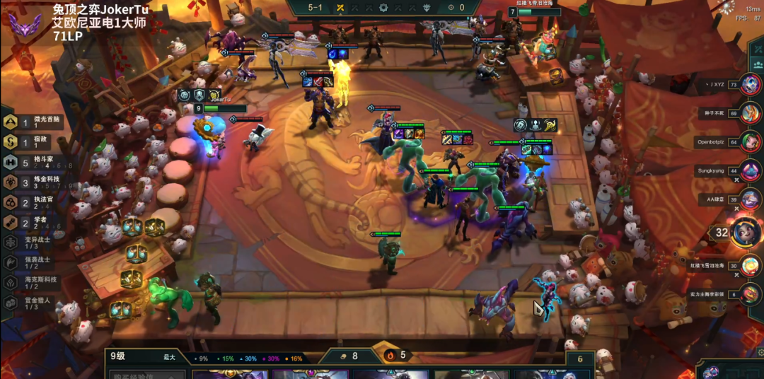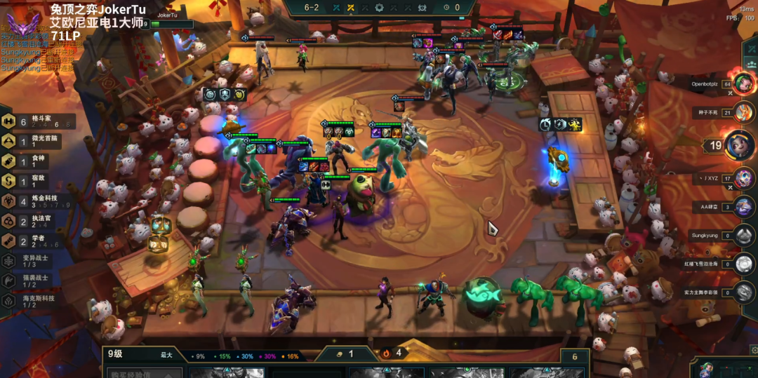 到了后期,质量才是第一位的,常规的德莱文碰到大成斗毒就是被吊打,靠着就是一堆五费两星的强大,而且有塔姆装备多,过渡期偶尔能见到怪物断你连胜,但是你的容错其实比正常运营还高,因为绝大多数人你都能赢,最终集体5费2星,就有机会吃鸡了,连败斗毒和连败德莱文一样,这种极致的运营对常规运营的强度属于碾压,成型基本上就是决赛圈。