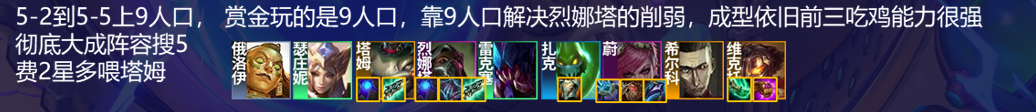 斗毒和德莱文因为削弱,德莱文已经成了8人口吃分阵容,斗毒8人口甚至不配吃分,所以两个阵容吃鸡的方式一个是三约极限连败,一个是赏金极限连败,实际上他们玩的不是8人口阵容,而是9人口阵容,别人5阶段成型,他们4阶段成型,别人6阶段9人口大成,他们5阶段就成了,这就是逆版本的方式。