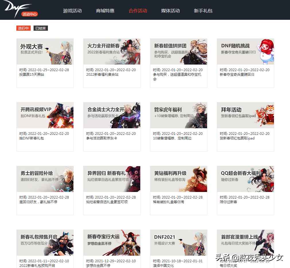 首选要告诉大家的是,每个版本刚一更新的时候,为了提高玩家们的活跃程度,DNF官网都会推出大量的活动,我们要经常光顾官网,这样才不会错失白嫖机会。方法交给你们:先进入DNF官方网站,然后找到活动中心,进入后点击合作活动查看。