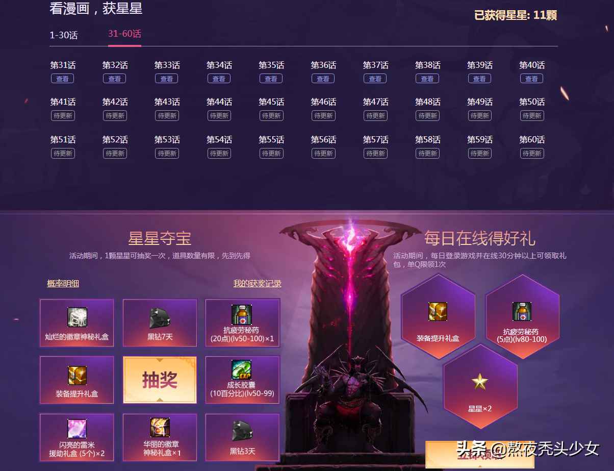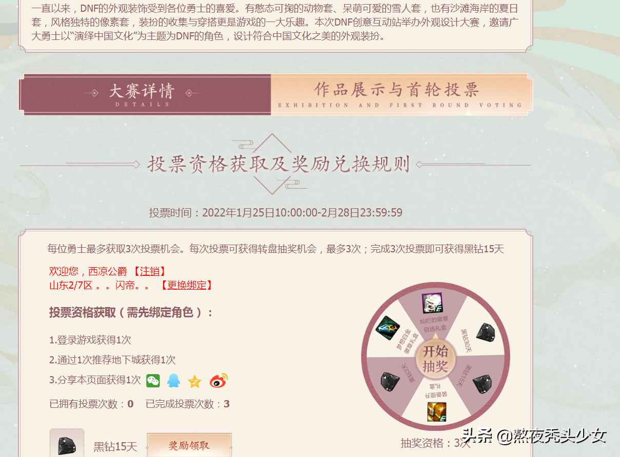 这个活动时间持续一个月之久(1月25日-2月28日),希望小伙伴能在活动下线之前看到小编的这篇文章。操作很简单,登录游戏、通关一次推荐地下城、分享页面就可以获得三次投票机会,投完三次票就可以领取黑钻15天。