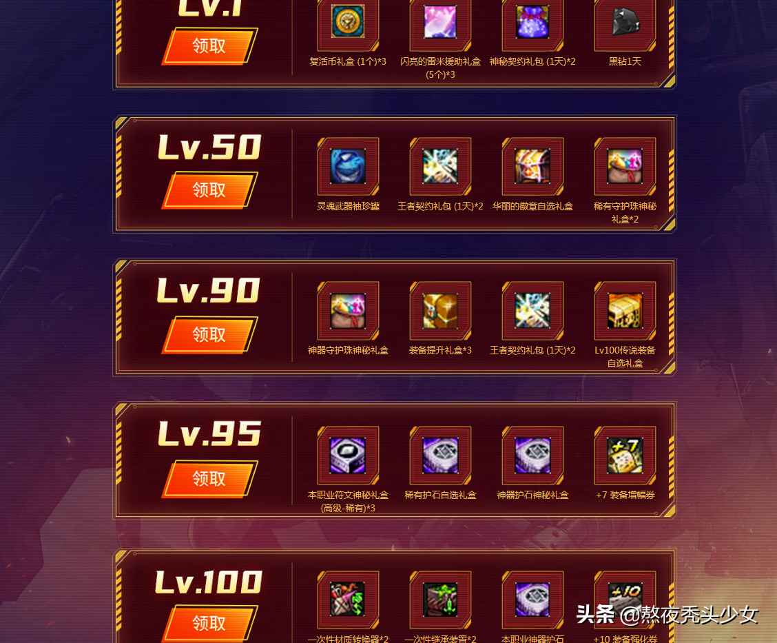另外,该页面还有合金战士升级礼盒,达到对应等级就可以领取,1级就能领黑钻一天。别小看这一天,多32点疲劳会让你比别人多升5级。