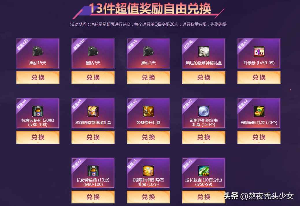 接下来才是重头戏,用星星兑换的道具里有黑钻!如下图,每个道具可以兑换20次,给大家算一笔账,总共可以白嫖黑钻(15+7+3)*20=500天!那么星星够用吗?白嫖的这500天黑钻要消耗星星(20+10+6)*20=720颗,每天签到送两颗,一年365天共送730颗,可见就算不看官方漫画,我们也可以成功白嫖这500天黑钻!
