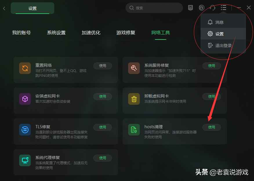 同样还是在奇游加速工具上面进行操作,打开奇游客户端右上角的设置,选择网络工具,再点击重置网络和hosts清理就可以修复网络。玩家等待奇游修复结束后,再重新打开美测服登录游戏即可。