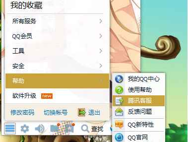 1、首先,在电脑上打开QQ,点右下下角的菜单按钮,再点击【帮助】-【腾讯客服】;