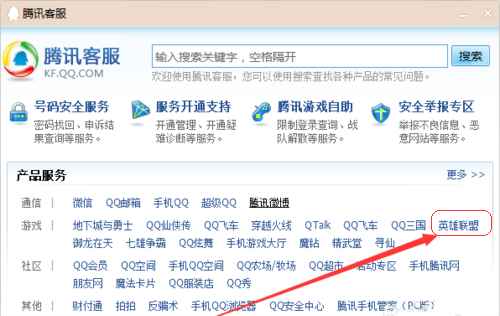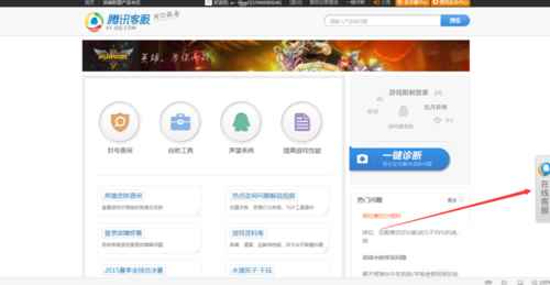 2、在弹出窗口中,点击【英雄联盟】会打开一个网页,点页面最右边的【在线客服】;