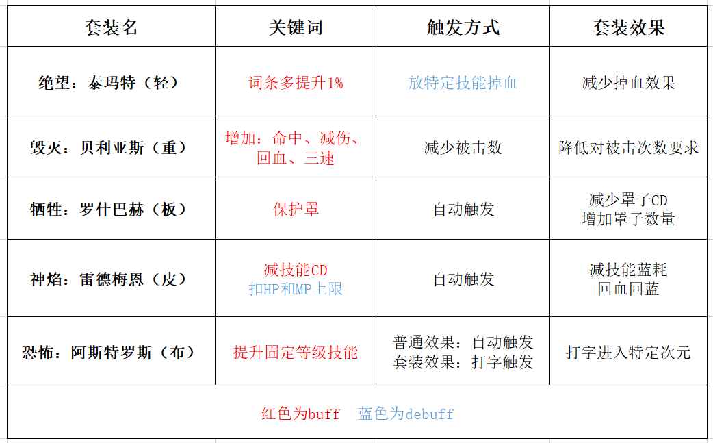 泰玛特、阿斯特罗斯这两套主要是偏向伤害,贝利亚斯、罗什巴赫这两套主要是偏向生存和手感,雷德梅恩主要特色为减CD。