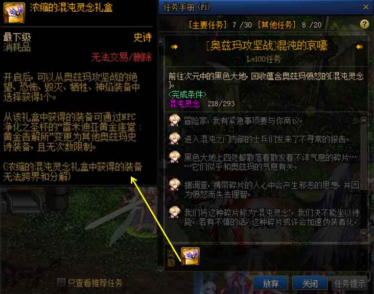 消耗293个混沌灵念可以完成“混沌的哀嚎”任务,完成后获得“浓缩的混沌灵念礼盒”,开启后可任意选择一件奥兹玛装备,俗称百变怪。