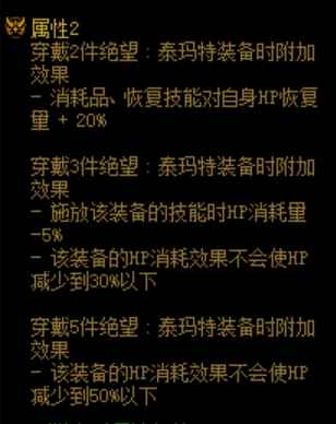 泰玛特每件伤害词条比其他装备多1%,合计多6%,是最稳定的伤害提升。虽然泰玛特有扣血的debuff,但是套装效果可以抵消部分扣血效果。如能凑齐至少三件套的话,泰玛特也是十分优秀的装备。