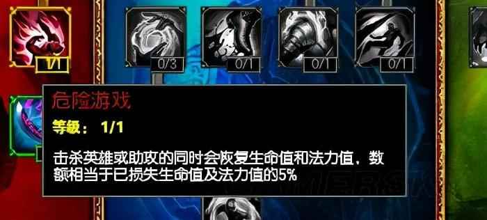 如果你是非常想秀的一个人那么危险游戏这个天赋是必须要点的,这个天赋会让你击杀助攻后恢复生命和法力值非常赚,如果你现在有2000血损失1000血5%就是50血,大家都知道如果你团战这么下来你的助攻或者击杀同时都有,那么你就可以回复多少血?大家可想而知,更何况adap没有出什么血量装备,所以要想秀起来这个天赋是必须要点的。