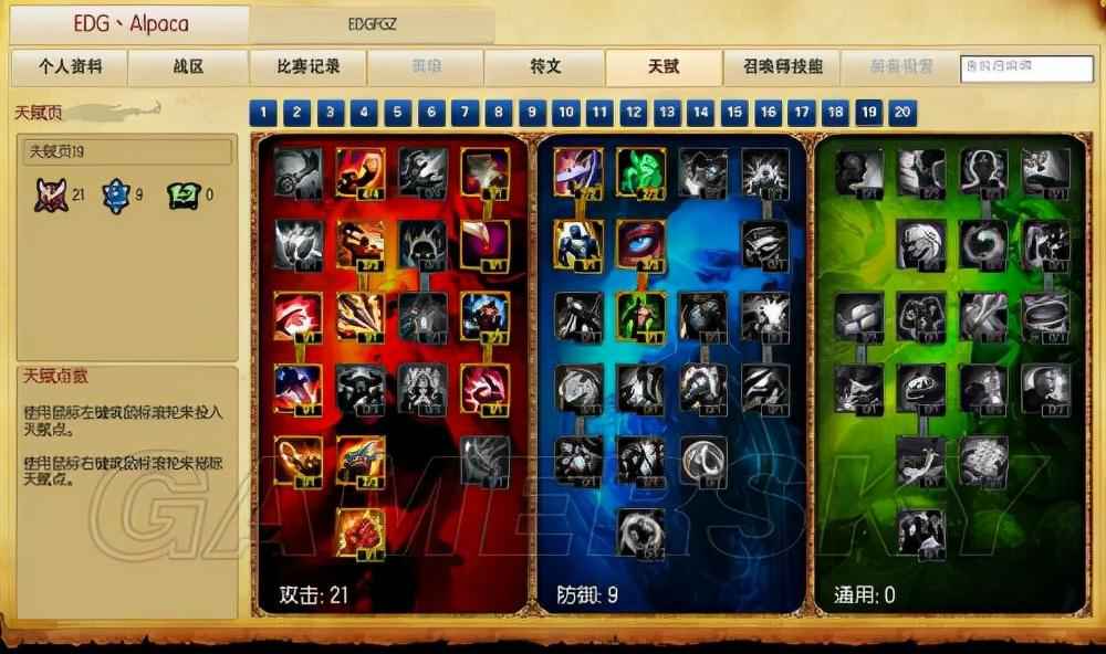 这个是deft的ez天赋,大家看他没有选择绝对的21-9,天赋就是这样具有搭配性。可能对面选了一个非常凶的组合,比如日女奥巴马男枪女警啊这种前期比较凶的,羊驼可能需要用q技能来补刀或者是很快的叠出女神之泪他就点出了回蓝。所以这个天赋就是比较适合什么呢?就是ez这种前期不强,靠技能打伤害的ad,而且ez没有暴击。他毁灭攻势旁边那个暴击提高攻速的那个他没有点。因为蓝ez并不靠普攻打伤害,所以就把这一点到了上面提高队友输出上面去了。
