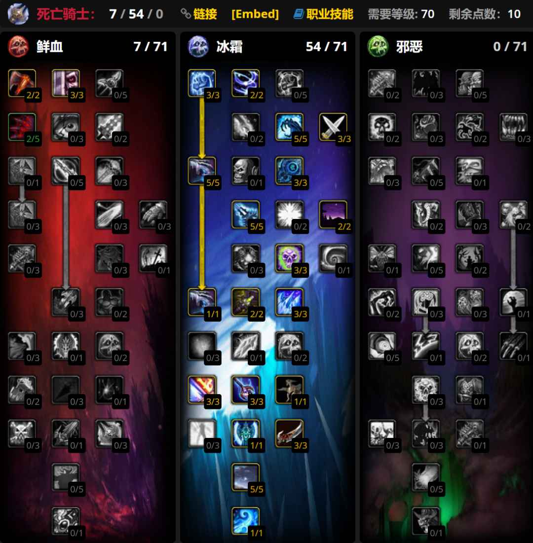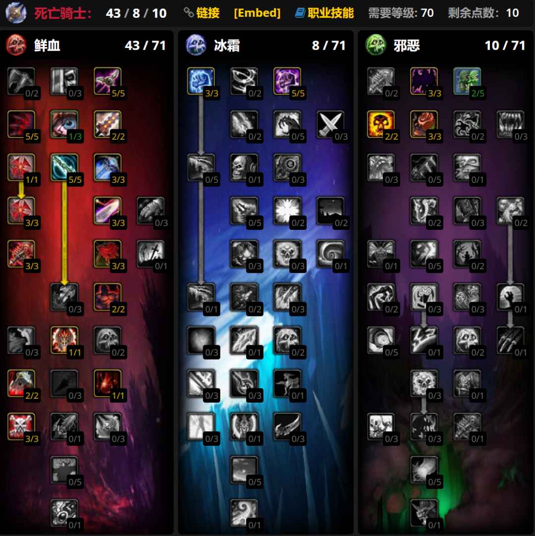WLK版本DKT只有双手血DK,推荐用邪恶系点出蔓延和病变的43/8/10天赋强化DKT薄弱的群拉能力,如果只打团本主单拉也可以点43/15/3强化单体仇恨,大雕文使用疾病和吸血鬼之血雕文,小雕文使用活力分流、传染和亡者复生雕文。