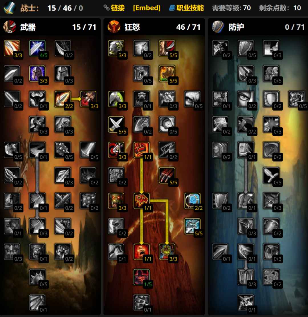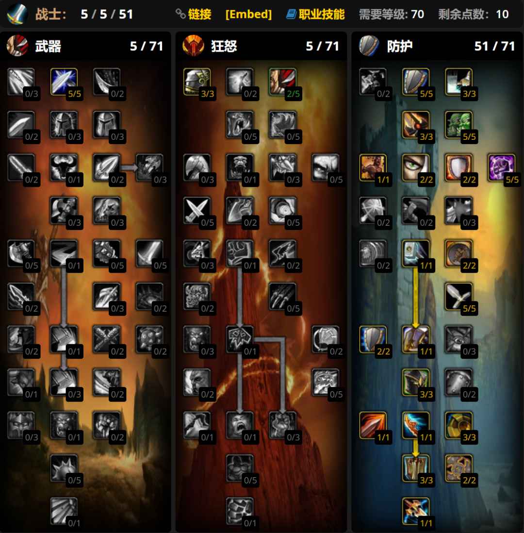 防战天赋比较灵活,可以根据需要点偏肉或偏仇恨向,上图为仇恨向天赋。大雕文使用复仇和英勇打击雕文,小雕文使用雷霆一击、冲锋和战斗怒吼雕文。