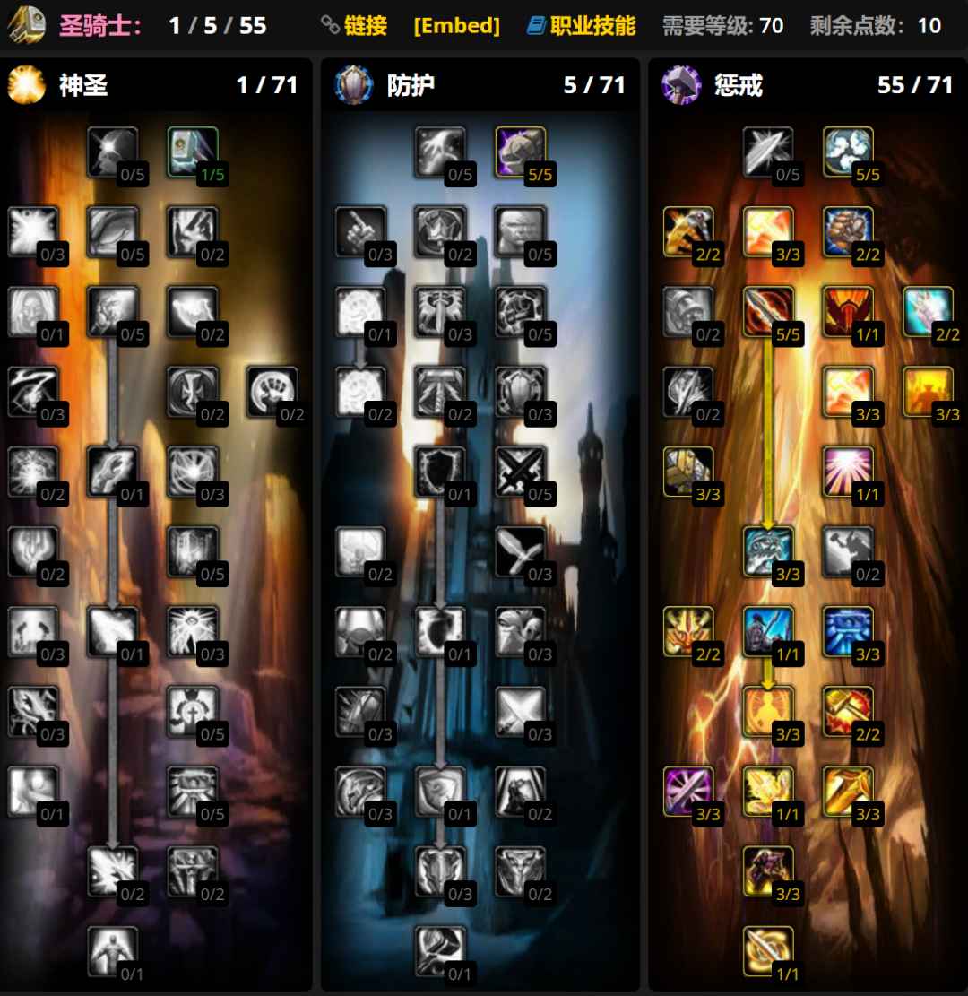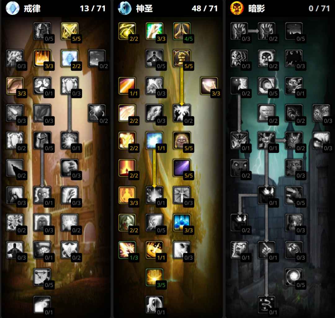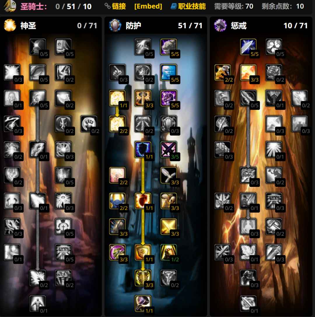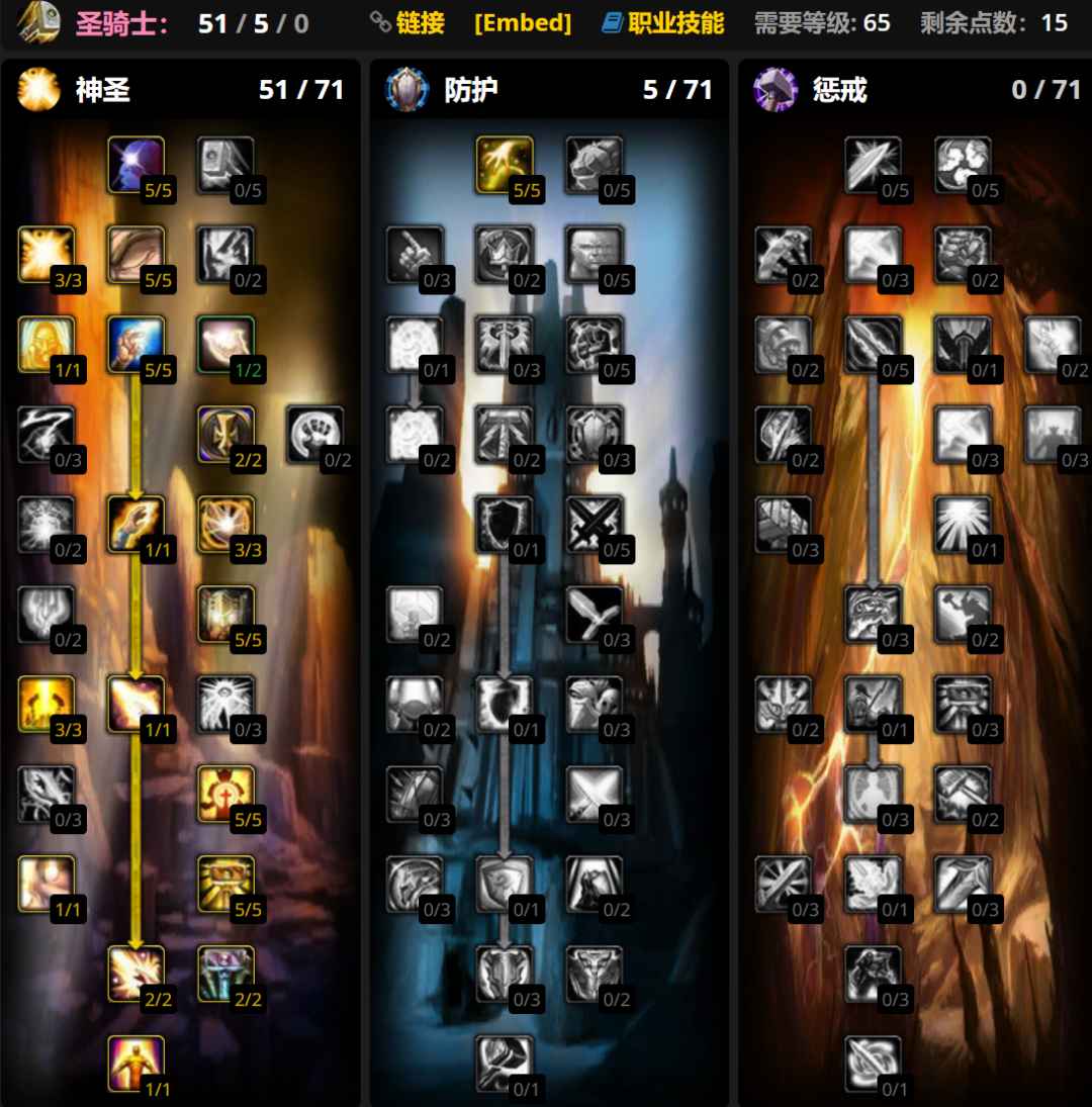 防骑要根据队伍构成灵活调整天赋,有惩戒骑就不用点十字军之心,没奶德就要出强化虔诚光环,只有自己单T的时候要点出正义审判。大雕文使用审判和正义防御雕文,小雕文使用圣疗雕文。