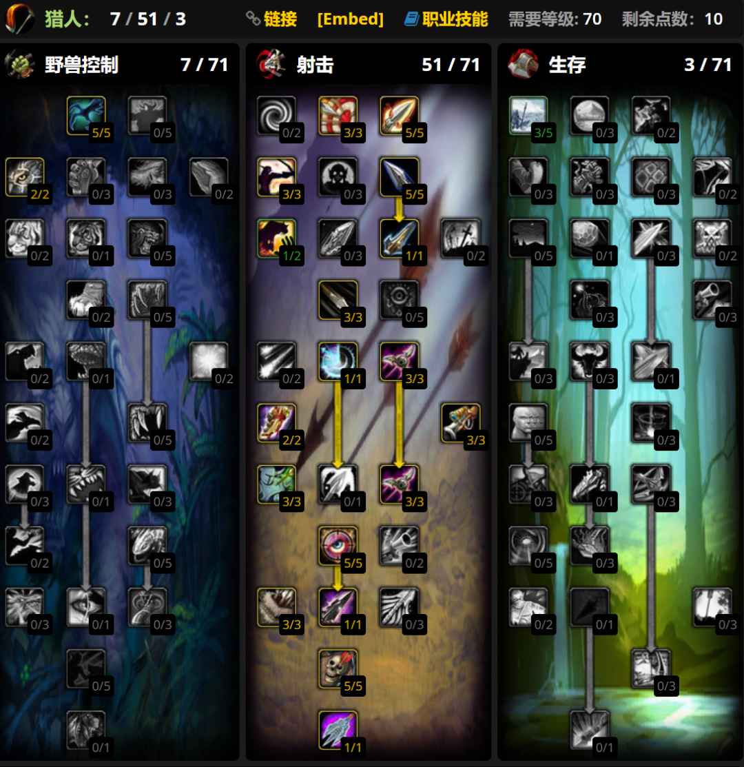 前夕射击猎DPS最高,根据实际情况可以将专注瞄准调整为强化奥射和直取要害,大雕文使用瞄准射击和毒蛇钉刺雕文,小雕文使用假死、复活宠物和治疗宠物雕文。