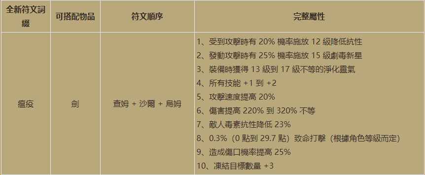 第一个符文之语是瘟疫,符文顺序是32号查姆+13号夏+22号乌姆,虽然只需要3颗符文,但是最高要用到32号,造价并不算便宜,受到攻击时有20%的几率施放12级的降低抗性诅咒,可以降低怪物大量的元素抗性,攻击时有25%的几率施放15级的剧毒新星,配合诅咒效果伤害应该还可以,附带的最高17级的净化灵气则是可以大大降低诅咒和中毒的持续时间,也算是比较有用的一种灵气,2点的技能加成和降低敌人23%的毒素抗性这两条属性,再加上底材是剑,还有20%的攻速提升、最高320%的伤害提升以及根据角色等级增加的致命打击、25%的概率造成伤口和冻结目标加3,明显是近战职业更适合,目测是毒狼的专用武器了,给第五关的佣兵用的话应该也不错,在前边抗怪触发诅咒的频率应该也挺高,伤害也不错,不过减抗效果肯定还是无限更加稳定,毒死灵的话还是死亡之网更适合,至于毒狼好不好用,要看测试服的具体实战情况了。