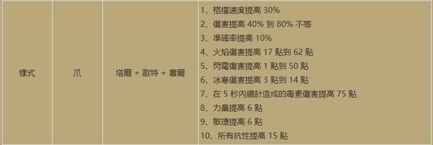 第二个符文之语样式是刺客专用的,底材只能用爪子,需要用到的符文是7号塔尔+9号欧特+10号书尓,非常容易获得,增加了30%的格挡速度,伤害提升最高80%,增加了10%的命中,还有火焰、闪电、冰冷、毒素四系的元素伤害,全部都是近战系的属性加成,还有6点的力量和敏捷加成,15点的全抗性,明显是为了增强武学刺客初期的开荒能力而量身定制的,配合上武学系技能的加强,或许武学刺客在前期也会有不错的表现,不过应该还是不能撼动陷阱刺客开荒四杰的地位,毕竟法系在开荒期的优势还是非常大的。