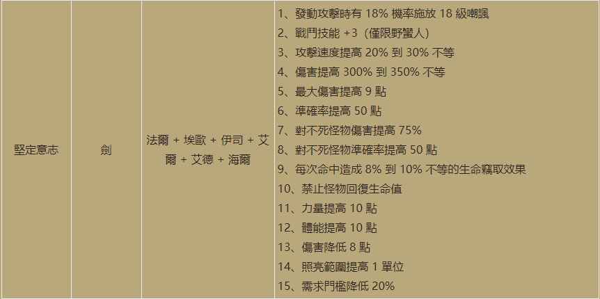 第三个符文之语是坚定意志,底材还是剑,需要用到的符文是19号法尔+16号埃欧+6号伊司+1号艾尔+2号艾德+15号海尔,用到的符文等级并不是很高,野蛮人战斗技能加3基本限定了是野蛮人专用了,攻击时有18%的几率施放18级的嘲讽,嘲讽是单体技能,嘲讽之后可以降低怪物的防御和命中,攻击速度提升30%,伤害提升了350%,还有最大伤害和命中加成,不管是第五关的佣兵还是野蛮人在中期的时候使用都是很不错的,还有10%的生命窃取,其他位置基本可以不用再堆吸血了,其他的属性都是属于锦上添花了,影响不大。