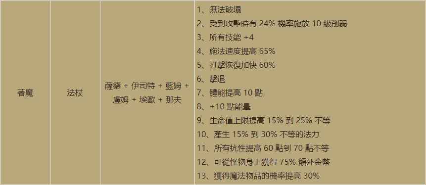 第五个符文之语著魔是一个双手法杖,需要用到33号萨德+24号伊斯特+20号蓝姆+17号虚姆+16号埃欧+4号那夫,第一个无法破坏的属性看看就好,不用在意,受到攻击有24%的几率施放10级的削弱,可以降低怪物的伤害,身陷怪群的时候能稍微增加一点存活几率,所有技能+4这个就厉害了,算上底材上附带的技能加成,应该是整个游戏中增加技能最多的装备了,施法速度也是高达65%,比手持电棒和精神盾还要高出10%,快速打击恢复也有60%,对于法师来说直接就到了8F的档位,另外还增加了最多25%的生命上限和最高70的全抗性,简直就是集攻击与防御于一体的神器,不过电法并不缺面板伤害,而是需要更高的减抗,手持镰刀或者新月、电棒应该还是主流,而冰法有死亡深度,配合精神盾一共有5点的全技能加成,还有最高30%的冰伤,而且还能开孔镶一颗冰珠,因此新符文法杖想要在电法和冰法中出头并不是很容易,目前来看只有火法并没有太过强力的武器,而且火法技能经过加强之后也是有了一战之力,也许这把武器会更适合火法来用。