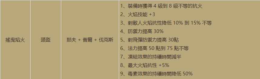 第六个符文之语摇曳焰火还是头盔专属,需要4号那夫+21号普尔+26号伐克斯,装备时可以获得8级的抗火灵气,基本不用再刻意去堆火抗了,火焰技能加3、降低怪物最多15%的火抗,很明显就是用来对标格利风和夜翼面纱的,但是造价要比格利风便宜的多,除了火法以外,元素德也是可以用,2.4版本对法师的火系技能和德鲁伊的元素系技能都进行了调整,配合上这个新出的头盔符文之语,应该是想让更多的玩家选择火法和毁天灭地德,到底好不好用就要在测试服上拉出来遛一遛,看看实际的效果如何了,其他的属性也都中规中矩,并没有什么亮眼的。