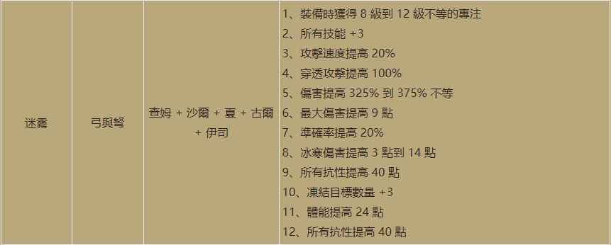 最后一个符文之语迷雾是弓与弩专用的,需要用到最高32号符文查姆,装备的时候获得最高12级的专注灵气,可以提供225的伤害强化,是弓马目前比较欠缺的属性,3MM玩法的话迷雾加信心的组合应该会比信心加风之力要强力一些,3点的全技能加成如果用大院长底材一共可以提供6点的弓系技能加成,元素弓用也是非常不错,穿透攻击提高100%则是解放了腰带的位置,不用再带剃刀之尾了,吸血鬼王之圈应该会更适合,有10%的攻速提升和生命偷取,伤害提升最高是375%,比当前版本的毕业武器信心弓还要高出40%,虽然没有无视目标防御的属性,但是增加了20%的准确率,40点的全抗和24点的体能也是使弓马脆弱的小身板稍微硬了一些,不过让京子拿信心弓马自己拿迷雾的话,狂热光环的效果会大打折扣,想要达到7F的攻速就需要从其他装备上获得更多的攻速提升,或许让京子拿迷雾来提供专注光环会更合适,虽然最终伤害依然是比不上拿骄傲的力量米山,不过京子在2.4版本加强之后,孰强孰弱暂时尚未可知。
