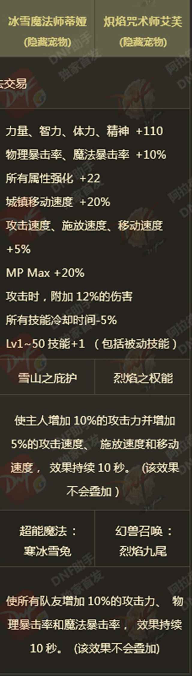 比前年的宠物多了5%的白字附加,比去年多了2%的白字附加。这只是基础属性,一看到宠物的技能,小编就知道今年的策划套路有多深,首先是增加暴击类,今年的史诗套,尤其是B套皮甲,可谓最缺暴击了,再来看看终极技能,简直就是为了促进玩家组队,再想想dnf这两年的安图恩,卢克团本,以及韩服新出的魔兽,天界Raid,都是需要玩家集结共同攻克的副本,再想到今年春节的春节活动副本,那个噩梦及的难度和卢克R足以匹敌,所以,我还是乖乖组队刷吧!