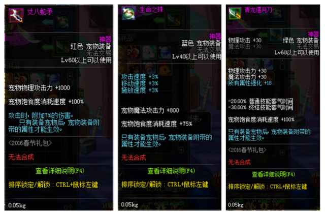 红色宠物装备的属性相同,蓝色又增加了暴击率,这和前面说到的,今年的史诗套就是缺乏暴击不谋而合,策划真的是为了年套,细节做的很全。绿色宠物装备绝对是今年的亮点,多了40点独立。(奶爸奶妈,固伤职业充钱三次警告!)看到这里,今年的宠物以及宠物装备,绝对是史上最强了,而且现在以及以后dnf的趋势,都是减少冲突,