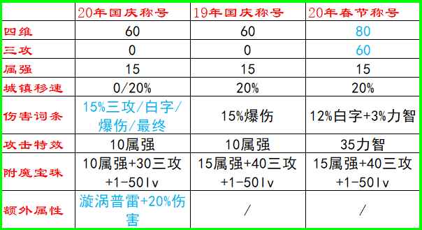 三者对比,可以发现20年国庆称号的劣势在于,没有三攻加成,并且四维也比春节称号少了20,普通称号没有城镇移速加持,另外在积分商城兑换的附魔宝珠也少了10点三攻和5属强。
