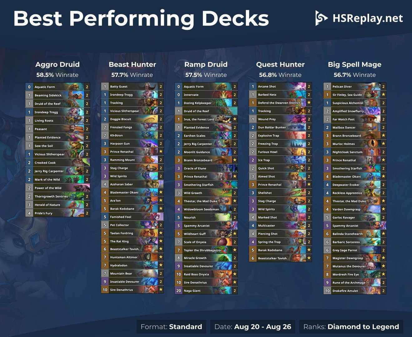 大数据网站 HSReplay 公布了近期胜率最高的卡组: