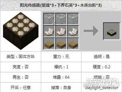 我的世界中红石这一方面是很多玩家们一直在不停的探索和研究的,不要小看这款像素风方块游戏,红石科技能研究的东西很多,玩家可以通过这些不断的开拓自己的创造力和创意度。阳光传感器就是跟红石有联系的,游戏去的玩家可以尝试着做一做。