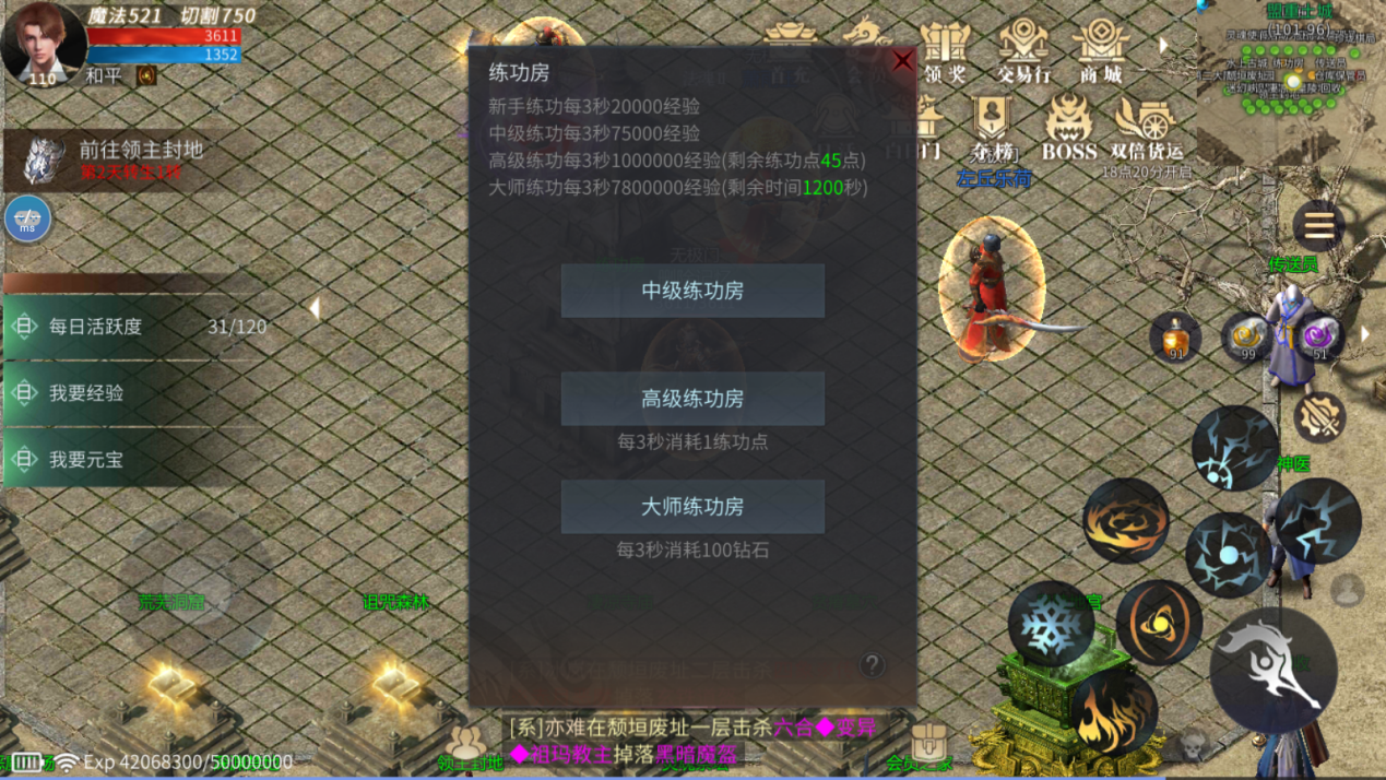 还有就是高级练功房和超级练功房,每天都可以获得练功点来泡高级练功房,至于超级练功房如果最后冲榜差一点点可以用这个快速超过前面的。打怪途中会爆出地图固定的经验丹。