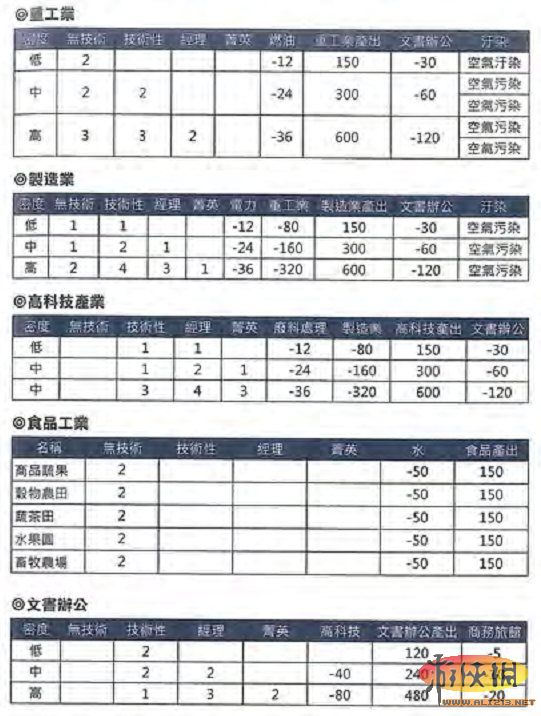 我们可以选择:高密度重工业、中密度制造业、低密度高科技、农业、中密度办公,