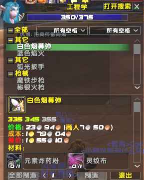 划重点:335以后要到沙塔斯城找星界商人拉斯莱买白色烟雾弹的图纸。可以练到350。