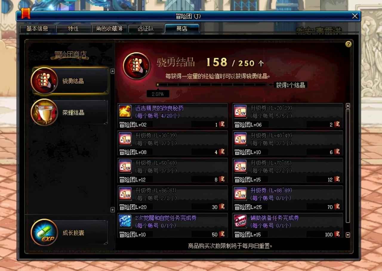 这也是另一个重要的升级途径,新职业预约活动会送,基本上每5级,或者每10级,就会送升级券,加上冒险团的大量升级券,玩家们将近三分之一的等级,都可以直接用升级劝搞定。冒险团的成长胶囊也不要忘了,因为给的经验值是固定的,所以尽量前期用。虚弱药剂也可以准备一点,比如到后期,有些主线任务,8点pl以上的地图,进去4个房间,就完成了任务,那么到了这个时候就不要继续通关了,直接退出来完成任务就可以了。