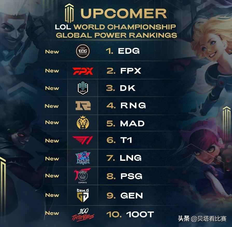 具体的排名如下,EDG排在世界第一的位置,第二名是FPX,第三名是DK,第四名是RNG,第五名是MAD,第六名是T1,第七名是LNG,第八名是PSG,第九名是GEN,第十名是100T。
