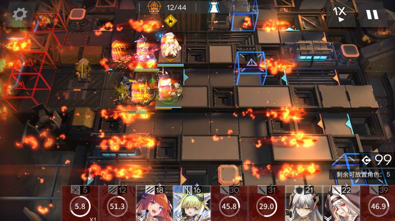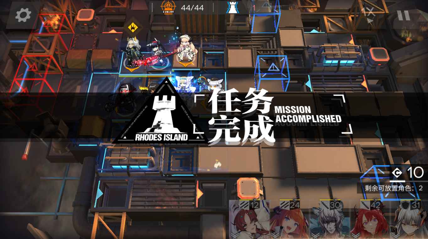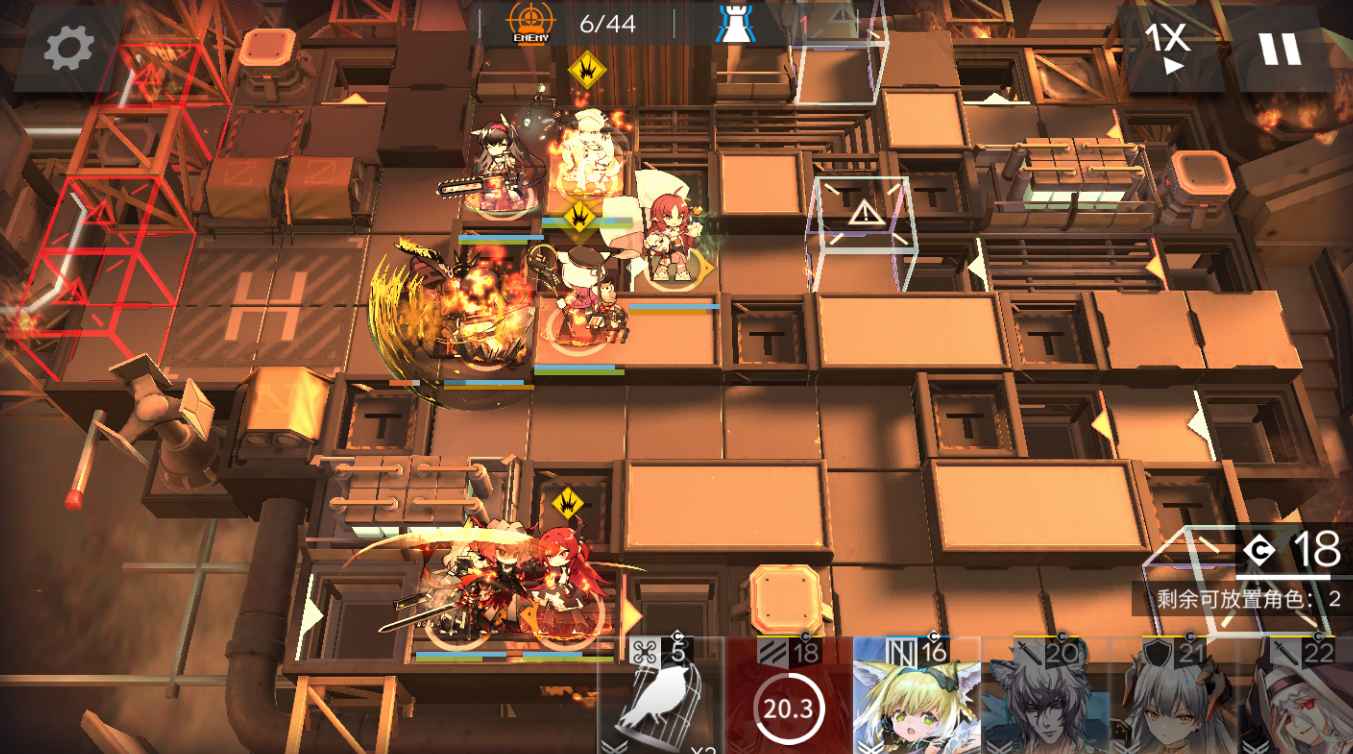 在其跑到右上角的时候扔下幽灵鲨和风笛再次围殴不出意外会打掉其第一管血,如果伤害不足,可以考虑一开始扔银灰补真银斩。
