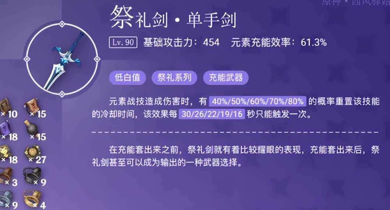 这是一把充能性极强的单手剑,一般也只能从祈愿池里抽取到。武器白值比较低但充能非常的高,满级可达61.3%,萌新们只需要知道角色充能高队伍输出的节奏就会非常好,玩起来也比较舒服。