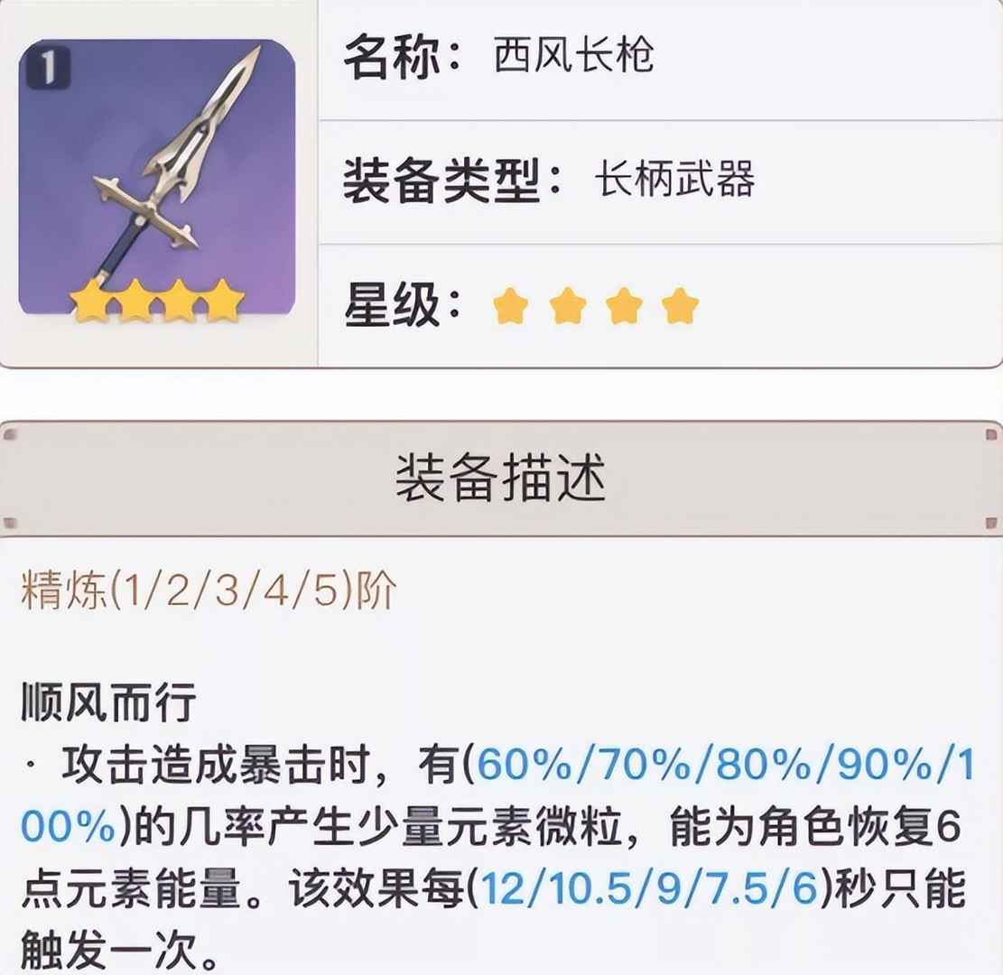 充能性武器,满级时有30.6%的充能效果,武器特效是暴击时有一定概率产生能量球为角色回复能量,满精后暴击可以100%产生能量球,是非常优秀的充能武器。