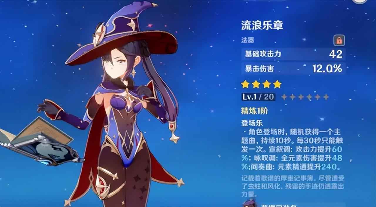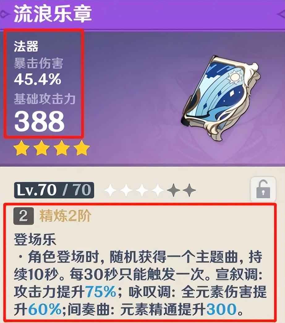 传说中的“人品乐章”或者“赌狗乐章”,武器特效是角色登场时有一定概率获得一个特效,或者增加攻击力或是增加元素伤害或者增加元素精通,而且加的数值还不低。要是特效正好是你当前角色需要的属性,那这伤害就非常爆炸了,反正则伤害尴尬。