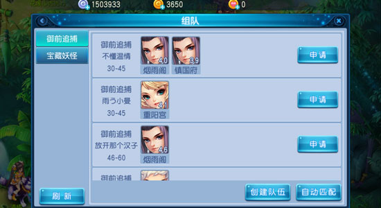 3.也可以点击组队界面加入队伍,来加入其他玩家的队伍,或者点击右下方自动匹配,系统随机分配队伍。