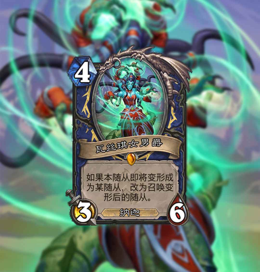 而随着宣传CG一同公布的新卡中,就包含了其中两位客人,之前的文章里已经聊过了,这里就再简单介绍一下,瓦丝琪女男爵,这位应该大家都不陌生了,加入暗影界后成为了锐眼密院的成员,卡牌趣文里也特意调侃瓦丝琪原本应该在探寻沉没之城版本登场,但是在外域的灰烬中发生了点意外,最终来到了暗影界。