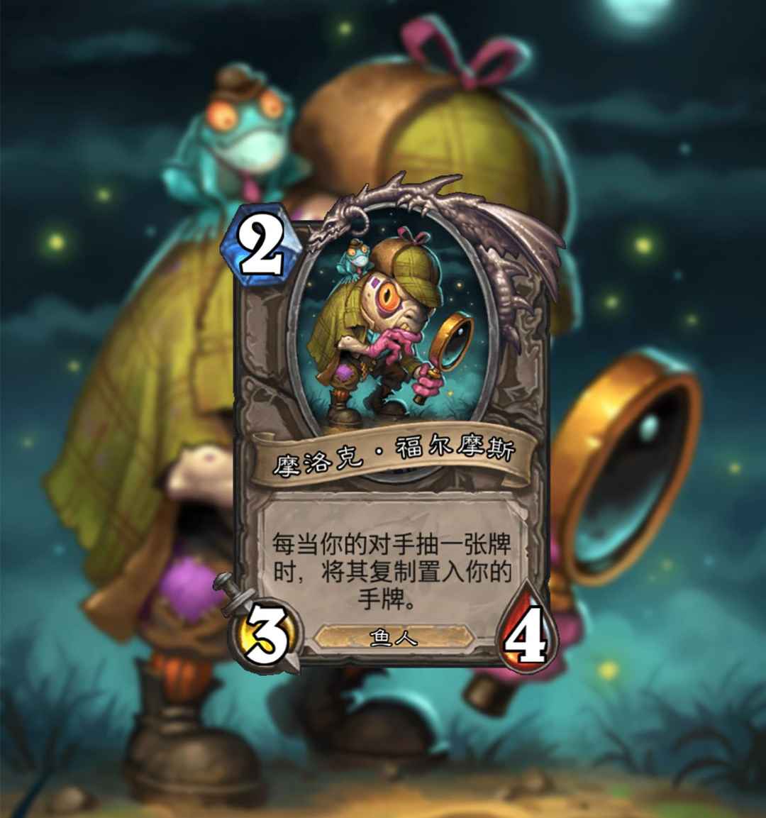 最后再提一下最前面的摩洛克·福尔摩斯,名字由来自然是著名的夏洛克·福尔摩斯,最初登场是在女巫森林作为一张宝藏牌出现,最初的效果和现在差不多也是复制对手的卡牌,而那个时候他的助手蛙生就已经坐在他的肩膀上了。从宝藏牌晋升为版本主角,这么一看炉石传说里可挖掘的原创角色还是蛮多的。