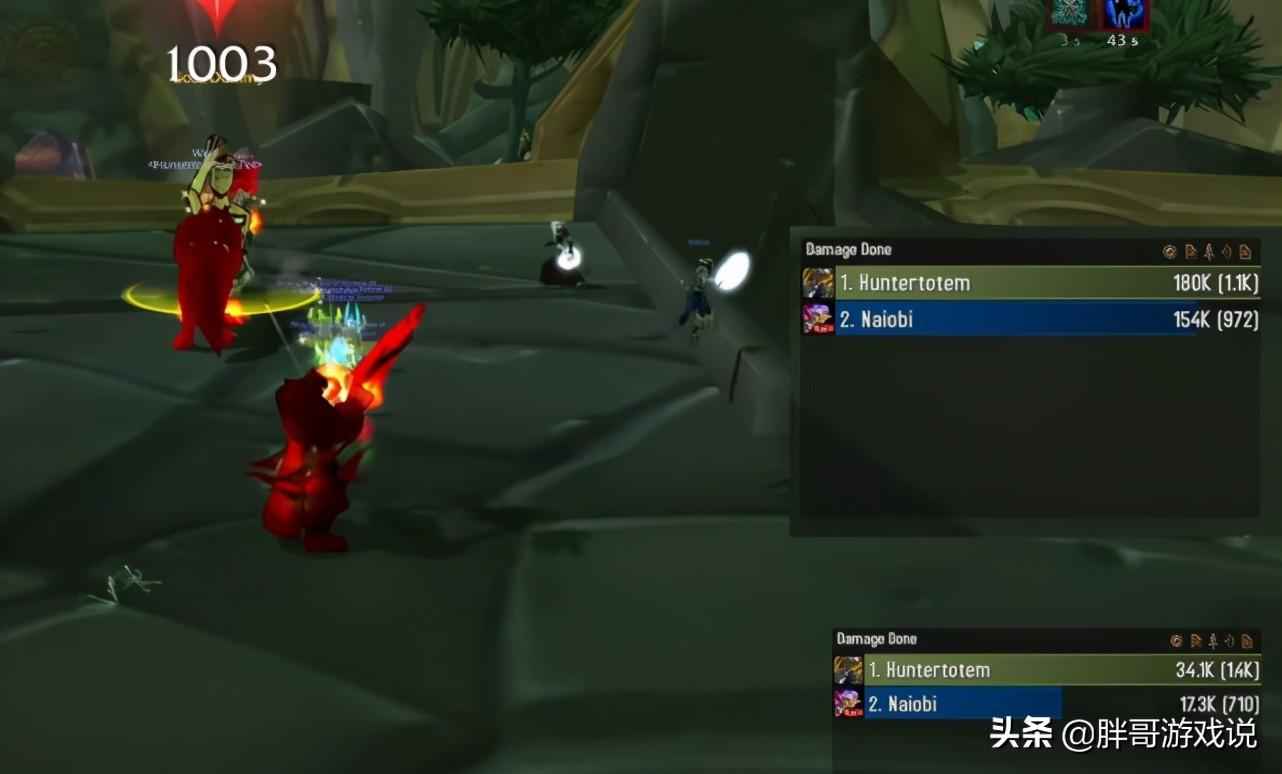 在猎人的测试中搭配了一名增强萨,测试时长为2.5分钟,天赋为兽王猎。整个测试过程下来,猎人的秒伤在1100左右,峰值伤害“人宠双红”的秒伤大概在1400左右。虽然这个秒伤在60级怀旧服中都不算什么了,但是在版本初期,这已经是全职业最高伤害了。