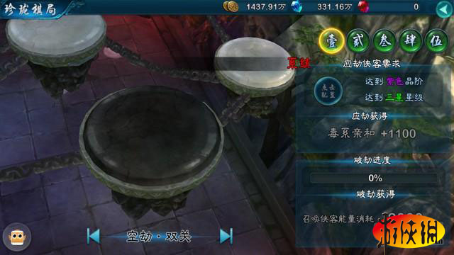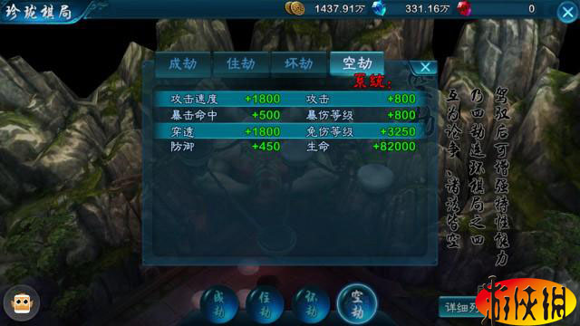 棋局一共分为 4个大劫 20个小劫 85个劫位 激活每个劫位可获得相应属性 进度条显示100%时可激活小劫附加属性 可以在原有劫位属性的基础上加上相应的小劫属性加成 激活整个大劫为何没有更强悍的属性加成 。大劫1-空劫详情:
