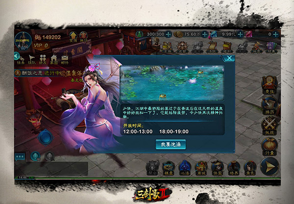 闯荡江湖,比武竞技,都不如寻处休闲娱乐的好地方,泡泡温泉,在这水气蒸腾中洗涤爽身,如梦如幻,真妙不可言也!