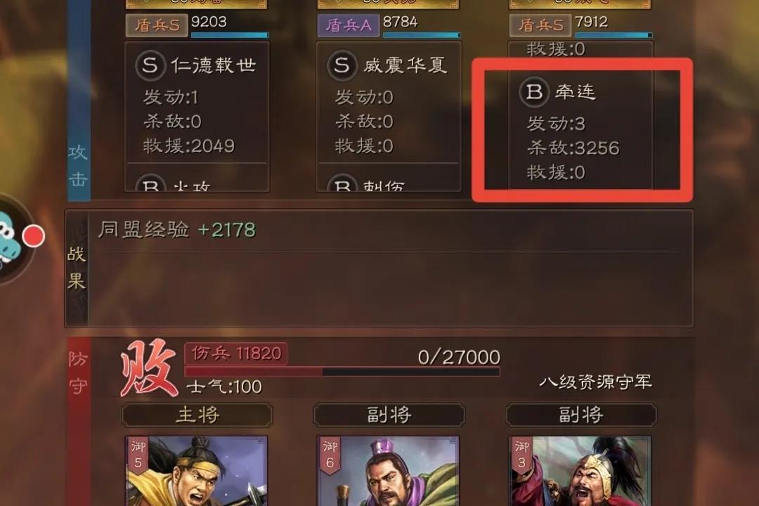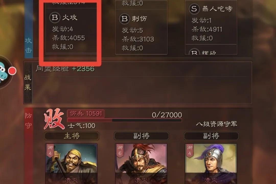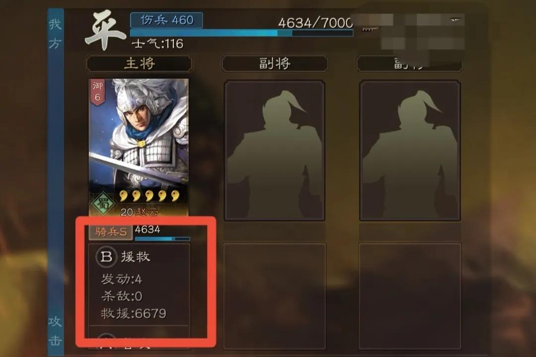 在S1前期开荒,技能资源都稀缺的情况下,援救强大的回复效果,可以节省大量资源。而且作为一个B级战法,游戏中期打架,一个援救回复七八千的血量,堪比刮骨疗毒!