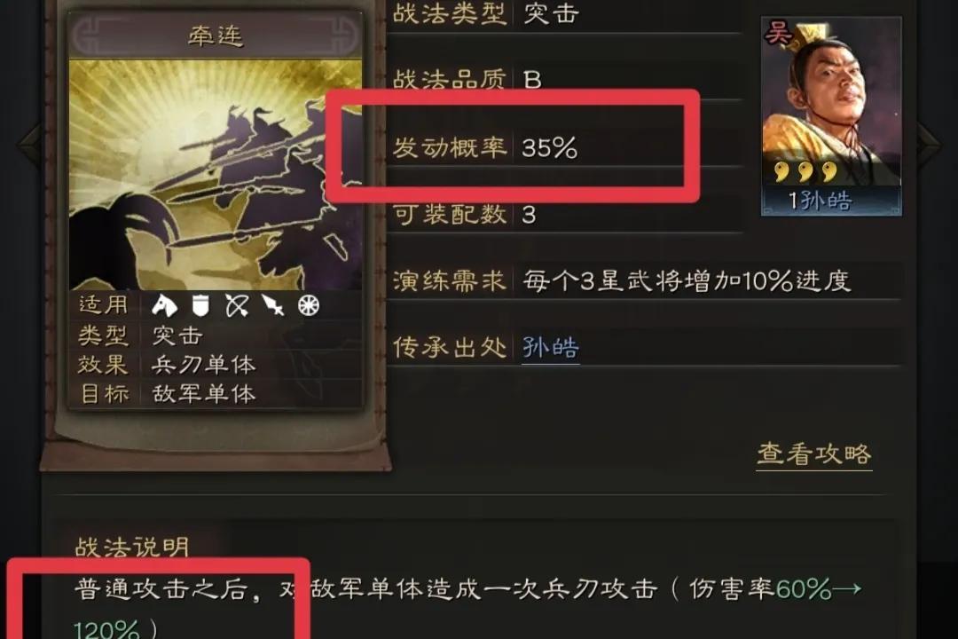 普攻后35概率触发,伤害120%,适合有多次普攻的英雄,列如太史慈弯弓饮羽+牵连,就是非常好的选择