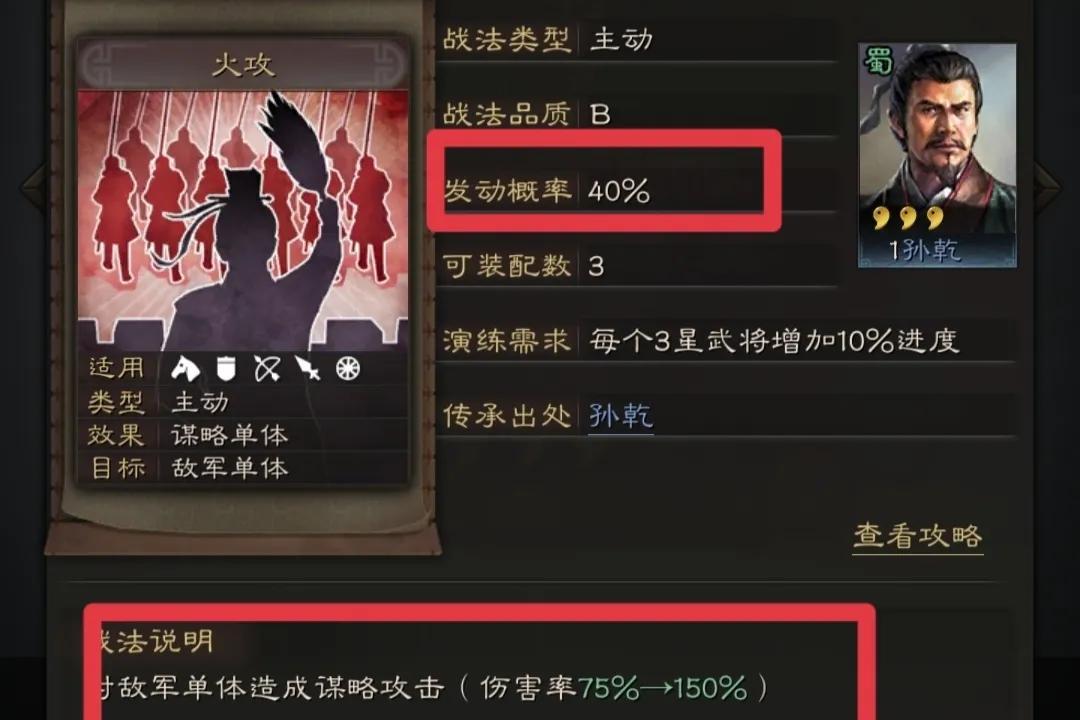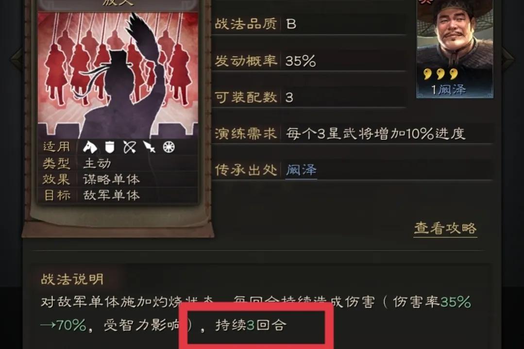 35概率看起来不高,但是放火会持续3回合造成伤害。用的好伤害还是非常可观的,尤其是对战藤甲兵