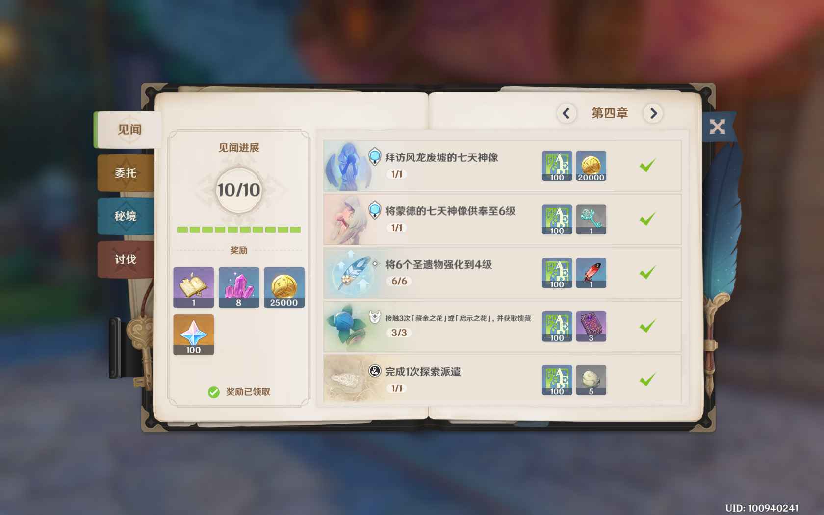 简介:在右上角书籍一样的图标里,有着见闻任务,相当于新手引导,这里可以获得两把钥匙。完成第四章“将蒙德的七天神像供奉至6级”任务可获得一把钥匙。
