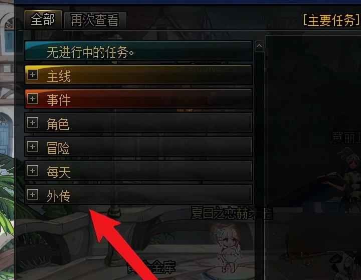 在游戏《地下城与勇士》中,德洛斯矿山火种任务的接取方法是玩家首先在游戏中点击游戏菜单选项,点击界面中任务选项。接着玩家在任务中找到外传。